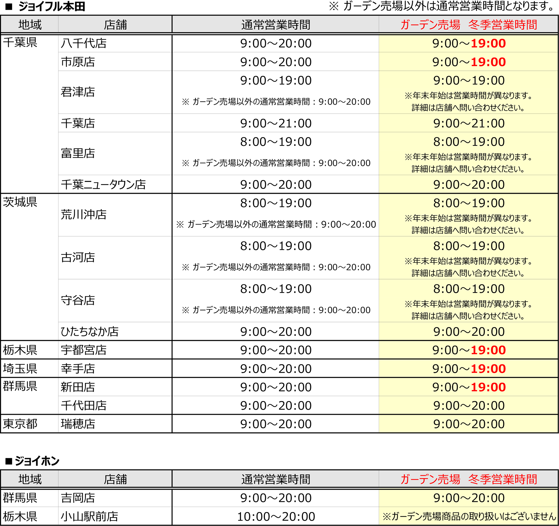 一部店舗において、冬季期間のガーデン売場営業時間を下記の通り変更させていただきます。